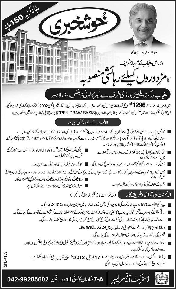 Labour Colony Lahore – Application invited from workers for Residential Scheme Flats