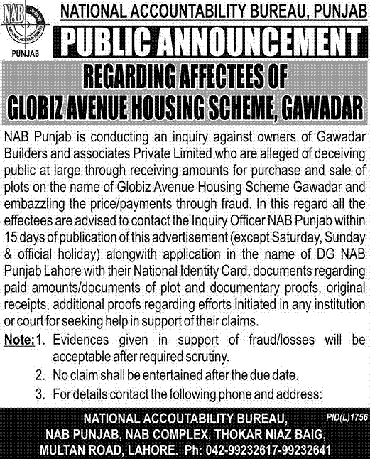 Globiz Avenue Housing Scheme Gawadar – NAB Public Announcement for Affectees