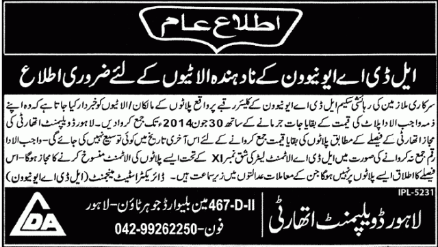 LDA Issued Notice to Defaulter Allottees of LDA Avenue-1 Lahore