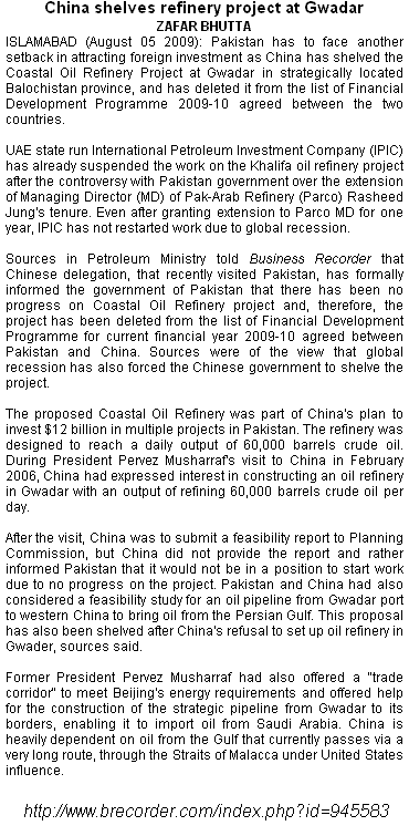 GHQ proposes strategic Gwadar oil refinery Chinese team arrive in Pakistan |