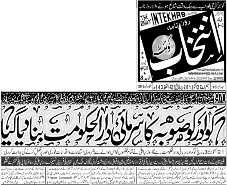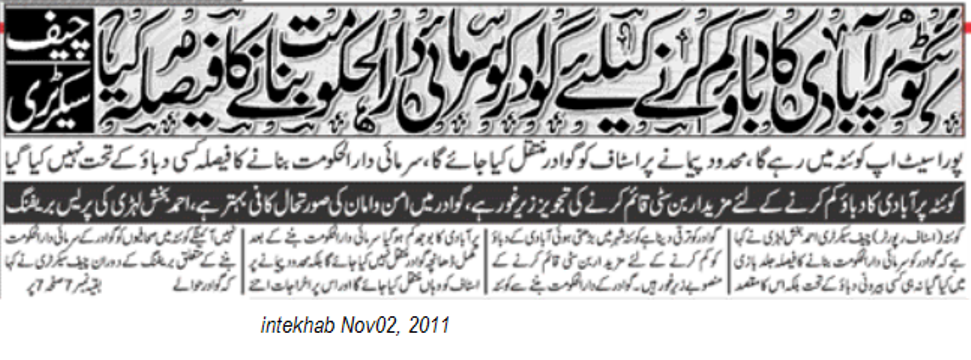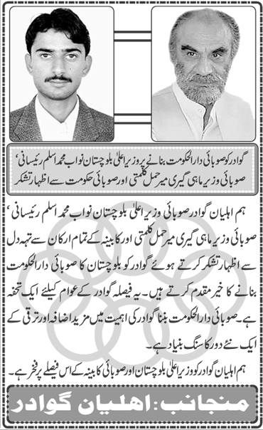 ![]() The proposal of making the coastal town of Gwadar the winter capital of the province was made by Speaker Aslam Bhootani two years ago.—File Photo QUETTA: Balochistan Chief Minister Nawab Aslam Raisani has declared Gwadar as the winter capital of Balochistan. “Gwadar will be the winter provincial capital of Balochistan from Oct 21 to March 3,” the chief minister announced here on Wednesday. He directed all government departments to make necessary arrangements for implementing the decision. The proposal of making the coastal town the winter capital of the province was made by Speaker Aslam Bhootani two years ago http://www.dawn.com/2011/10/27/gwadar-ma...istan.html |