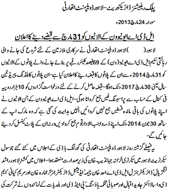 Lahore – The LDA (Lahore Development Authority) has announced that it will start handing over possession of plots to the LDA Avenue 1 allottees from 31st March, 2014. Possession of plots will be provided on 69% clear area of LDA Avenue 1.The body has also granted a building period of three years to the owners of plots. Applicants are required to deposit a processing fee of Rs. 10,000 per kanal for getting possession. LDA has advised the defaulters, who have not submitted their dues so far, to settle remaining charges by 30th June, 2014. Failing to do so will lead to the cancellation of their plots. To Buy and Sell in LDA Avenue 1 Call Mian Waqas of Lahore Real Estate 03334177716 or +92-42-111-111-040 Email:INFO@LREPK.Com http://www.lda.gop.pk/page.php?p=TVRJME5RPT0=#LTR |