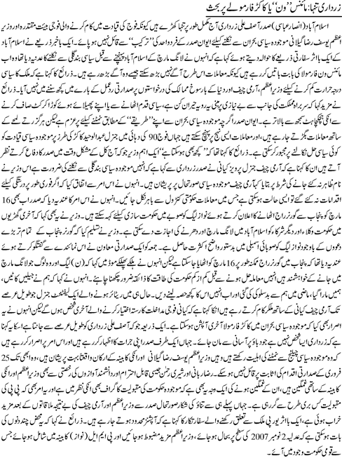 http://jang.com.pk/jang/mar2009-daily/15.../main3.htm ================================================ English translation of same news By Ansar Abbasi ISLAMABAD: President Asif Ali Zardari today stands completely isolated, as both the military-led establishment and the Gilani-led government are not convinced with the one-man recipe of the presidency to handle the present political crisis. A source, while quoting an influential diplomatic source in Islamabad, who had earlier indicated about the resolution of the present political impasse before the long march reached Islamabad, now talks of the minus-one formula, insisting that things cannot be allowed to proceed as they are presently. The source said that the requests by the prime minister, the Army chief and even by influential world capitals to cool down the present tempers remained unheard. The source said that such an indifferent response from the country’s president was surprising. He added that shying away from taking a political initiative to clear up the self-created mess was simply not understandable. Although, the presidency is determined to fight the present crisis in its own fashion, things are worsening with every passing moment and may lead to a situation where the military may force the present political leadership to get to a political solution as was done in the mid 90s by General Abdul Waheed Kakar. “I am expecting that anything could happen at anytime,” a source said. A key government minister, who is seen publicly defending President Zardari during these difficult days when most of the cabinet ministers are reluctant, said that Kayani had told the president that he needed to get the present political impasse resolved. The minister, on condition anonymity, said that the Army chief was upset with the present situation. He agreed that the situation may not come under the government’s control if corrective measures were not immediately taken. He, however, indicated that the president may still announce lifting of governor’s rule in the Punjab by 16th March and offer the PML-N to make the government in the province. The minister also said that at the eleventh hour, the government may also allow the lawyers and other participants of the long march to stage a sit-in in Islamabad, while ensuring that the participation remains thin. The minister conceded that despite tall claims of the governor Punjab, the PML-N continues to enjoy clear majority in the provincial assembly and the PPP had failed to muster the required support to make its own government. A presidential aide, while talking to this correspondent on Friday, also indicated that governor’s rule in the Punjab could possibly be lifted by March 16, but said in a lighter vein that the Sharifs and the N-Leaguers, who are desirous of going on the long march, should at least see the government’s muscles before the crisis was resolved by the presidency. “We faced jails, we were beaten up and maltreated in the past, now let them have a bit of it,” he said. A recently retired Lt-General, who has served with the Army chief for long, said Kayani would be the last person to go for the option of military intervention. He, however, insisted that the Kakar formula might be the last option to overcome the present political crisis in the country. However, a source, who closely knows President Zardari, insisted that Zardari was not the kind of person who would surrender to pressures. While the president continues to show a brave face and insists that he is capable of countering the present challenges, Prime Minister Gilani is really upset and so are the majority of his cabinet members. They are not convinced with what President Zardari did on February 25. The departure of respected and saner voices, Raza Rabbani and Sherry Rehman being the latest, have also saddened Gilani and his cabinet colleagues as they also see the popularity graph of the government and the PPP falling severely. While tension in the public further grew after the prime minister and Army chief’s meetings with the president on Friday remained inconclusive, a diplomat representing an influential European capital said that the options were getting limited for the president. The source said that it was a matter of days that things might change - the Nov 2, 2007 judiciary getting restored, the office of the prime minister becoming stronger and a national government formed. http://www.thenews.com.pk/top_story_detail.asp?Id=20923 |